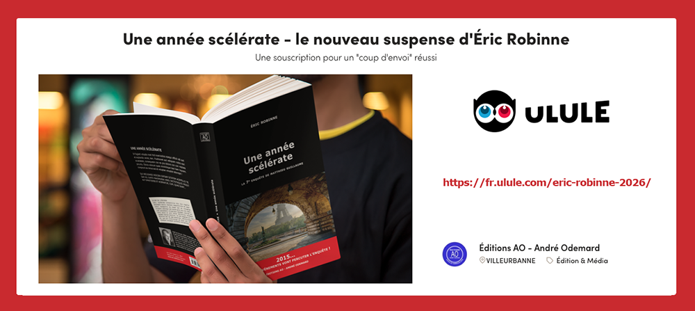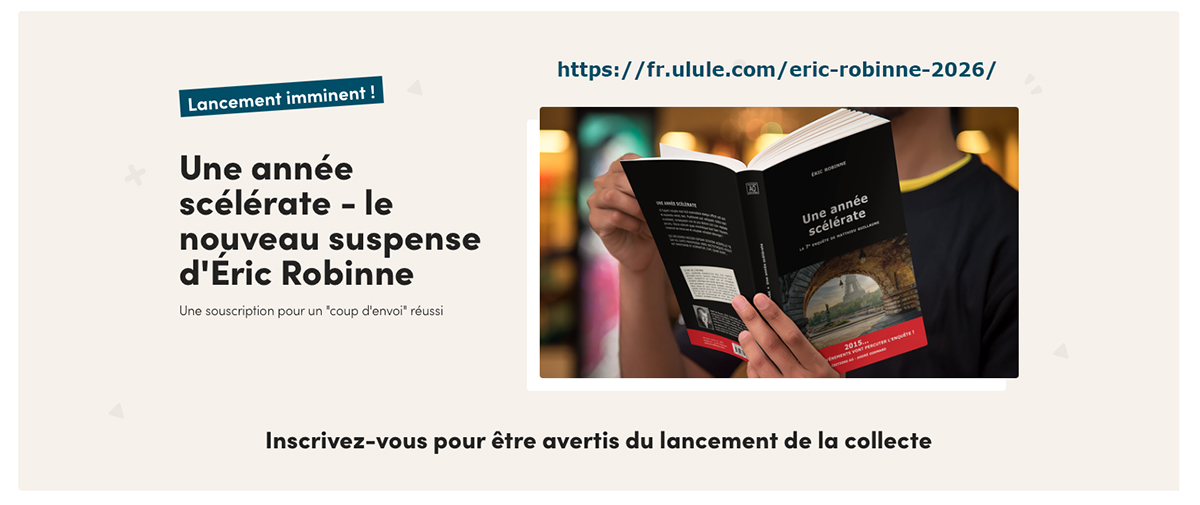 Prochainement sera lancée une campagne sur le site Ulule en vue de la publication du nouveau suspense d'Éric Robinne… Inscrivez-vous à l'adresse fr.ulule.com/eric-robinne-2026/ pour être prévenus de l'ouverture de la collecte.