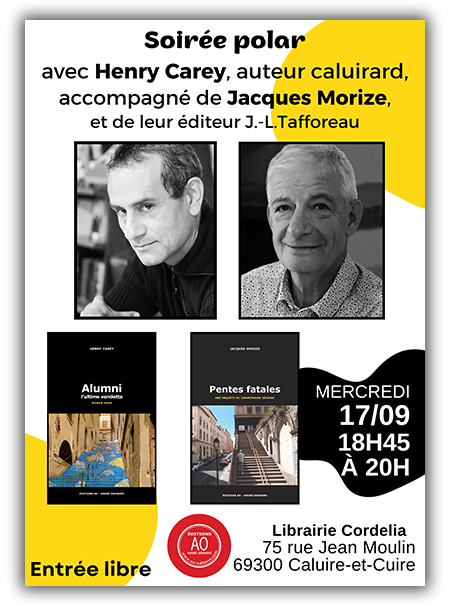 Henry Carey – un Caluirard depuis longtemps – présente donc son quatrième roman, Alumni, l'ultime vendetta, tandis que vous pourrez découvrir aussi les trois premiers. Jacques Morize, préfacier de Alumni, a récemment publié Gare aux Brotteaux ! et Pentes fatales, les dernières enquêtes de son commissaire Séverac.